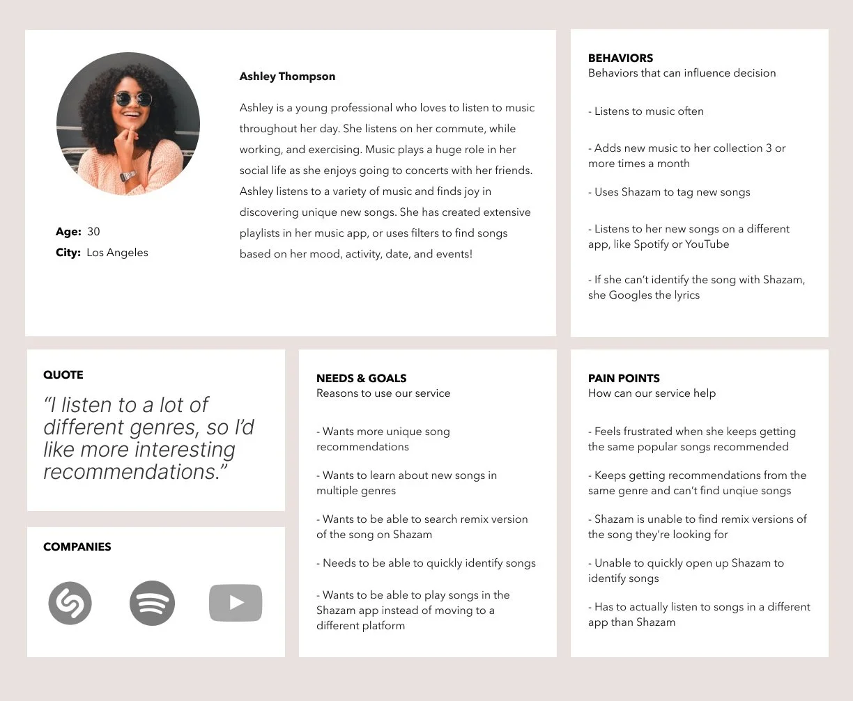 With all the research information gathered, we developed a user persona - Ashley. Ashley represents the behaviors and pain points of Shazam’s target users.
