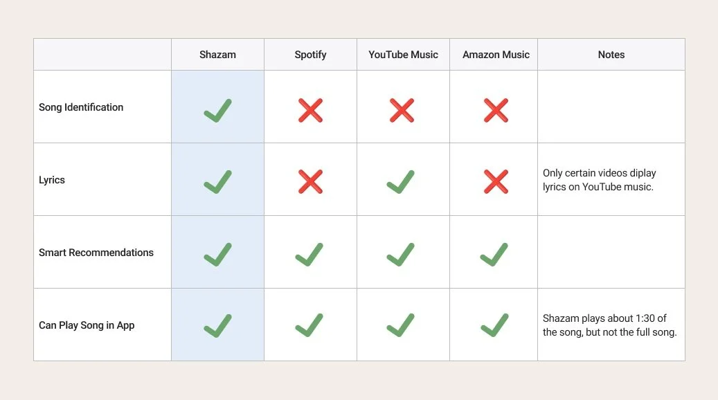 To find out what was missing from the current app experience, we looked at popular music applications to see what features other apps had compared to the Shazam app. We specifically looked at Spotify, YouTube Music, and Amazon Music.
