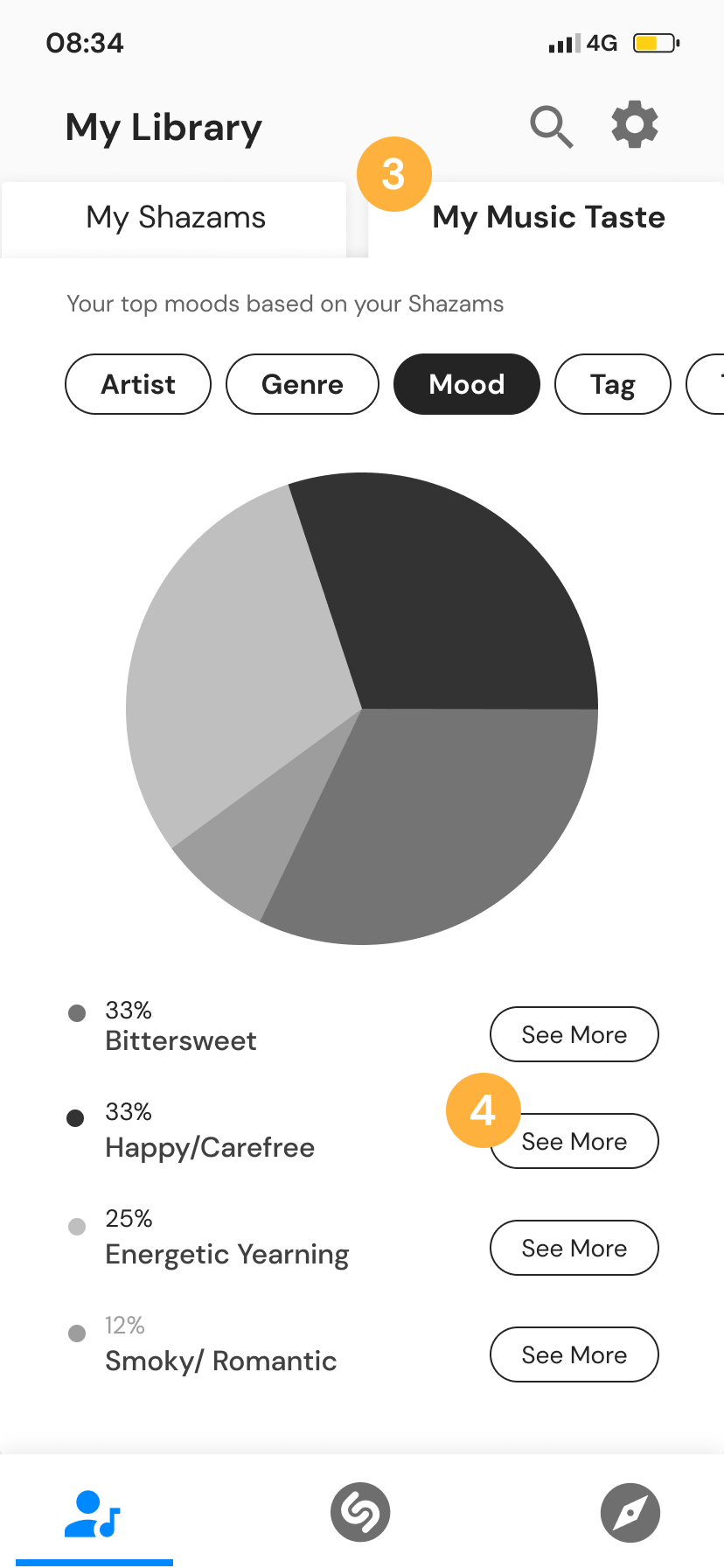 3. Users can toggle to the “My Music Taste” tab to view a pie chart summary of songs that are based on their past shazams, separated by categories