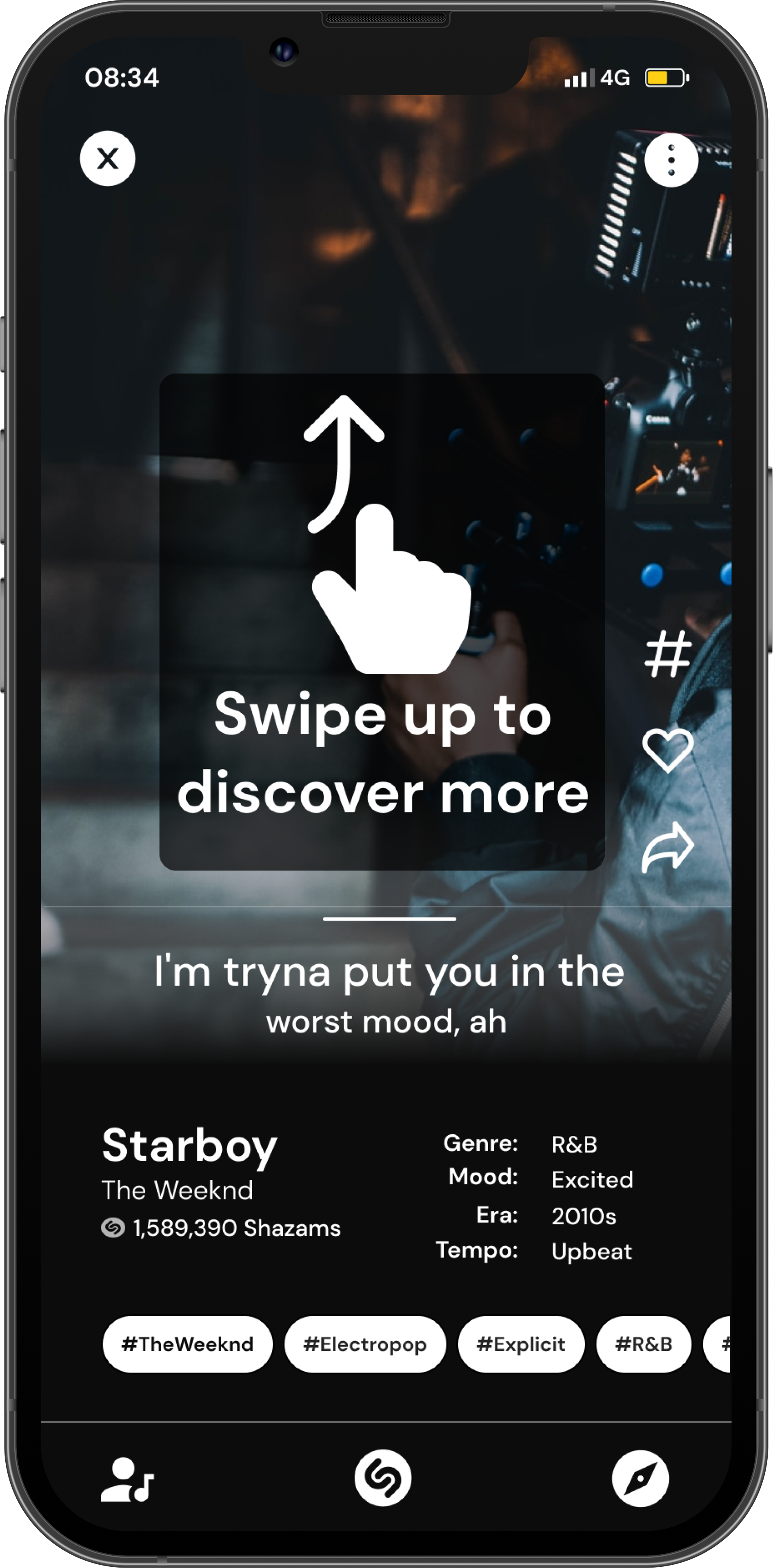 Users can swipe up from bottom to explore the next related song, similar to TikTok and Instagram Reels